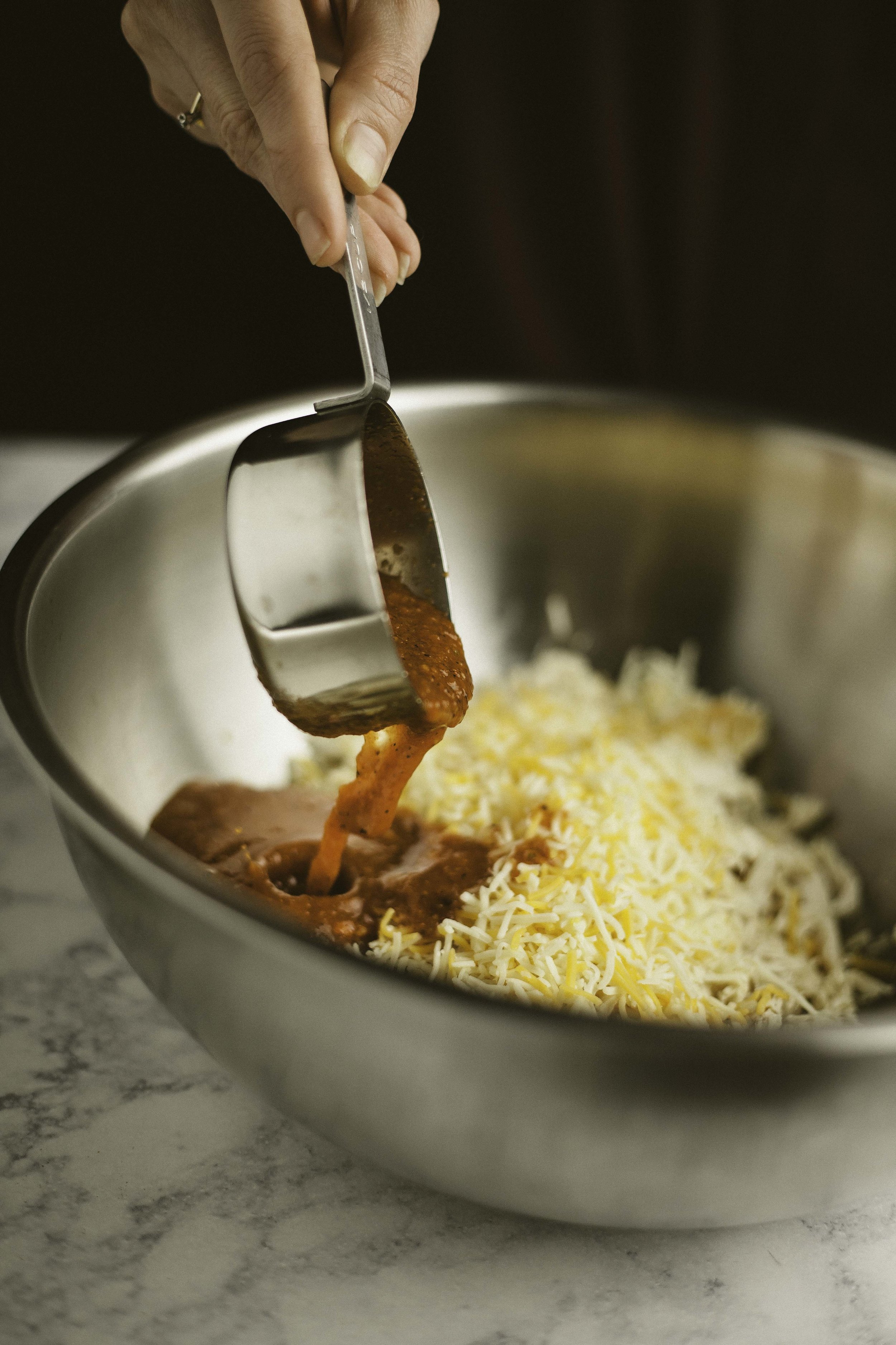 After your chicken is cooked, shred with a fork into smaller, bitesized pieces. Toss with about 1/2 cup of the enchilada sauce and 1/2 cup of shredded, Mexican blend cheese.